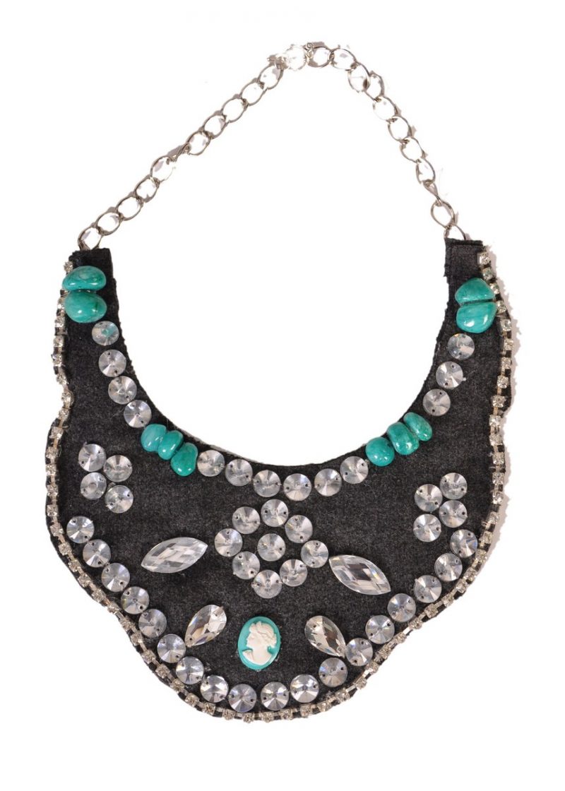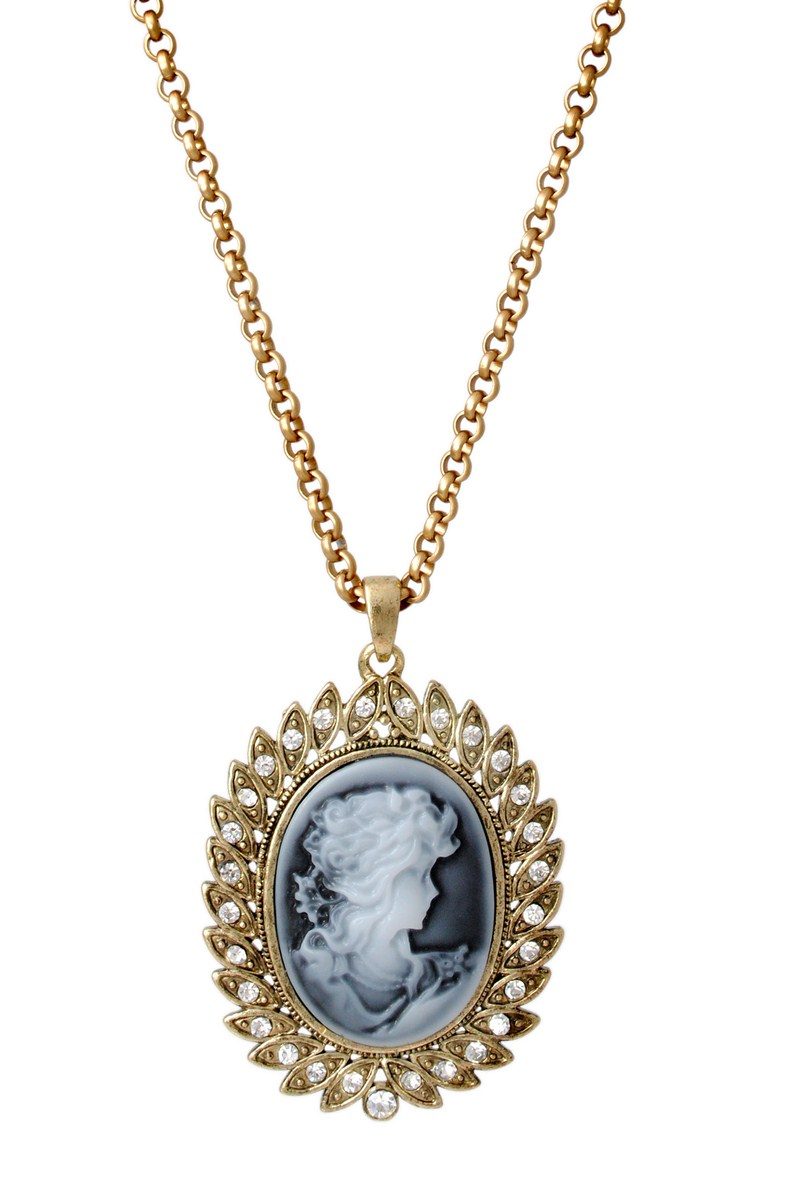 Adorned with a hand-carved cameo centerpiece and embedded with cubic zirconia, this necklace makes a bold fashion statement. Wear this vintage piece with a silk dress as part of a sophisticated evening look or simply during the day with at-shirt and jeans.