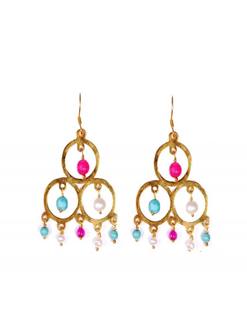 Feeling fabulous? These colourful earrings with turquoise, pearl and jade stones are a perfect way to rock a glamorous look. Wear them with a feminine chiffon blouse in a striking colour, a beige high waist skirt and heels.