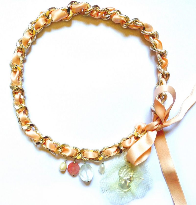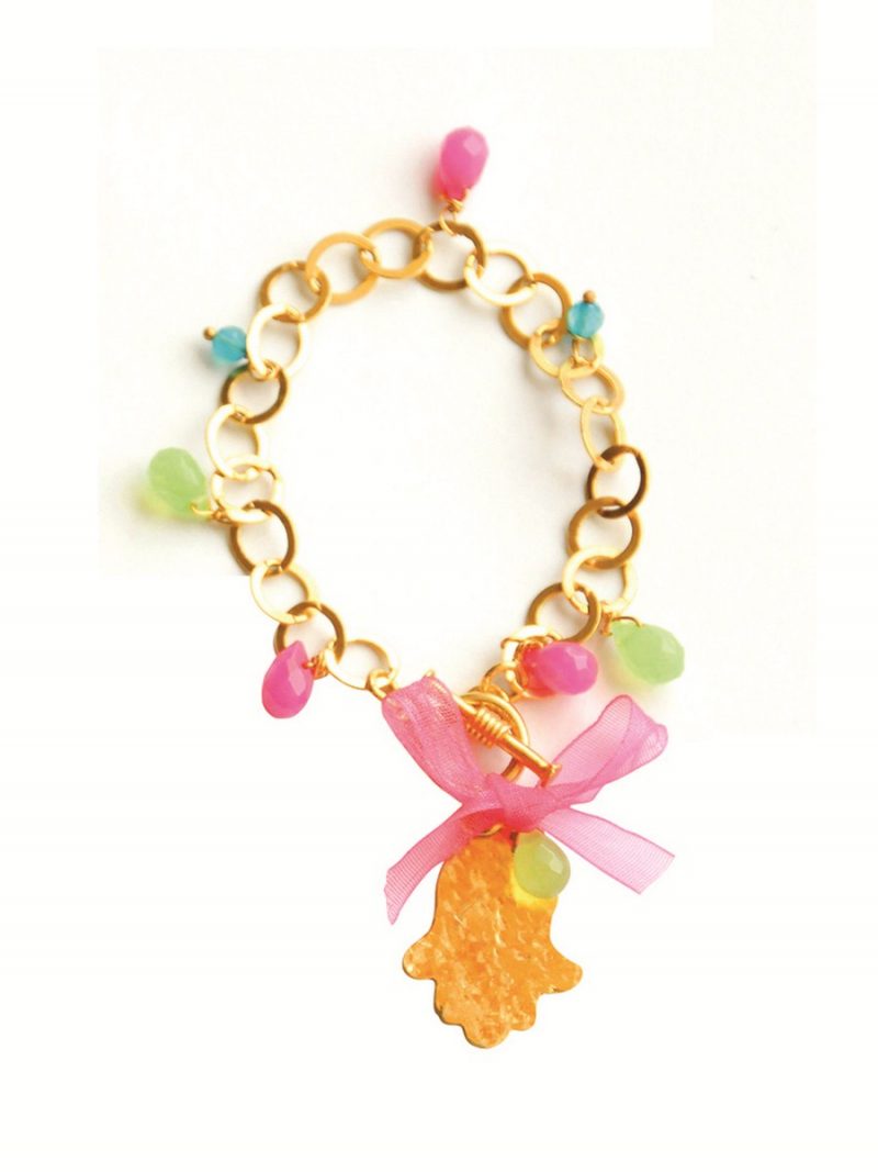 This charm bracelet has it all. The colourful ribbon and the gold chain make for the perfect addition to all your outfits.