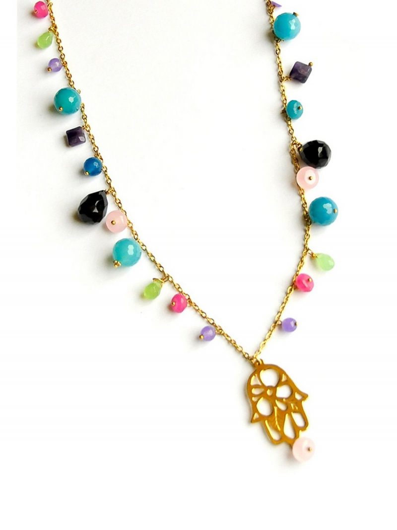 Strung with a gold plated chain and a mixture of pastel and dark colours, this long necklace will give you a great boho look. Wear it with a basic white T-shirt for a glamorous laid back look.