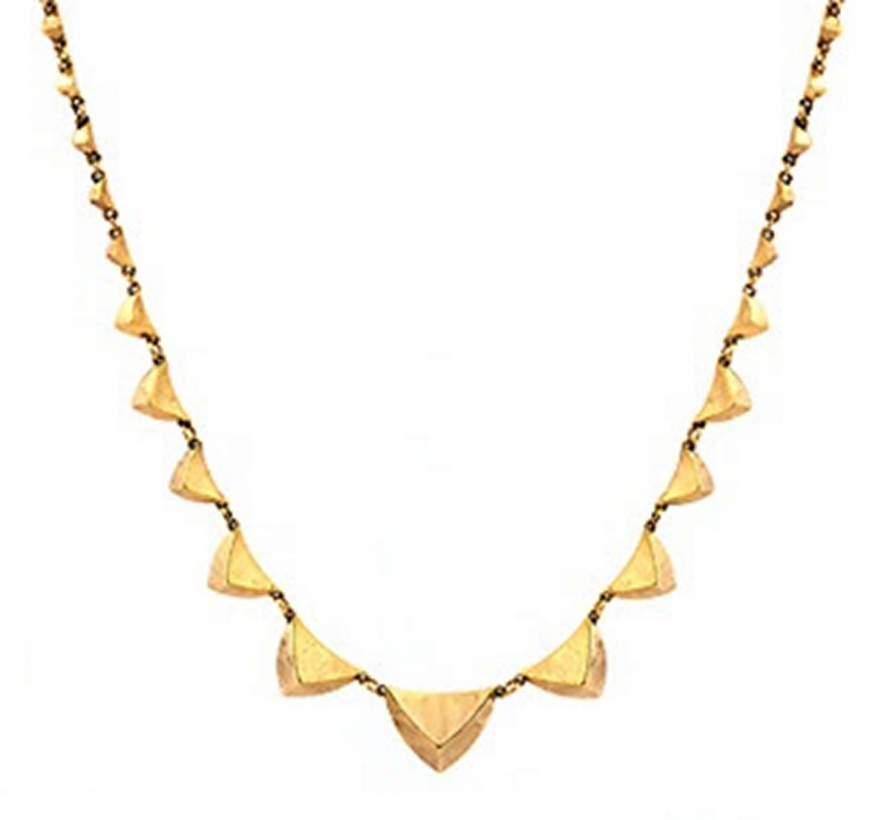 This intricately detailed necklace is the definition of unique elegance. With a long chain and small triangular shapes plated with 14 Karat gold, it is both lightweight and modern. Wear it with an evening gown in a solid colour to allow the necklace to stand out.