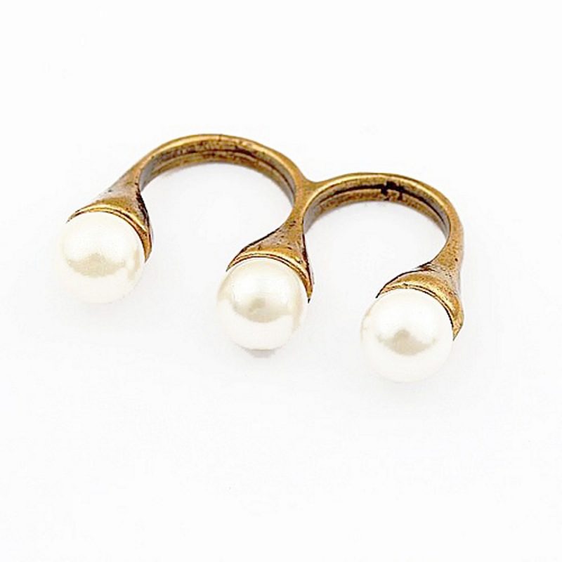 This unique two fingered ring is a beautiful example of contemporary femininity. Featuring three white pearls, this ring can be worn during the day or for a night out. Style it with a black or dark blue cocktail dress for a dazzling evening look.