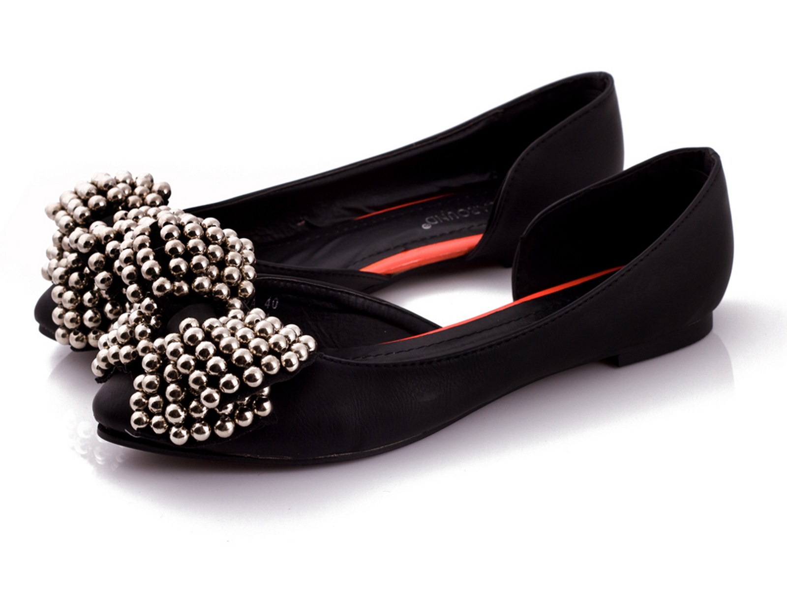 Black pointed leather ballerinas with silver bow.