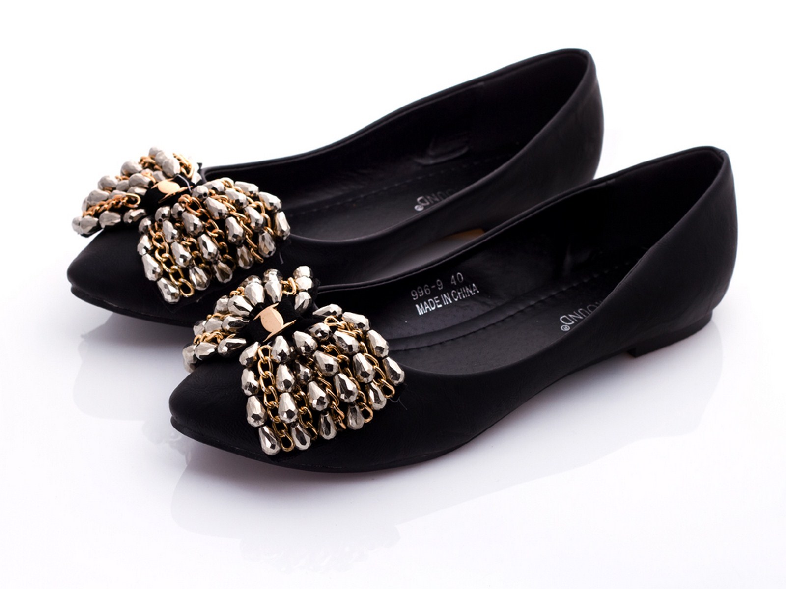 Black Pointed Leather Ballerinas with Silver Bow.