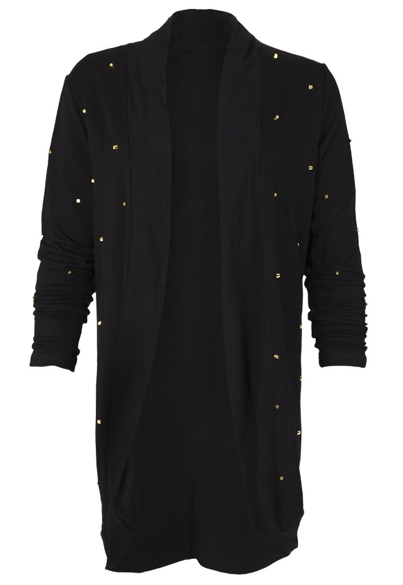 Add an edgy chic look to your outfits with this black cardigan with golden studs.. Team it with your favourite pair of skinny jeans and black flats for an effortlessly chic look.