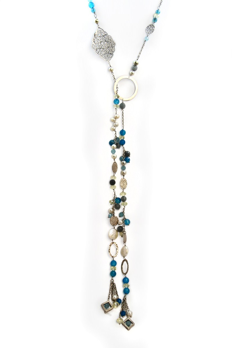 Twisted and knotted to perfection, this long necklace with blue agate is a spring