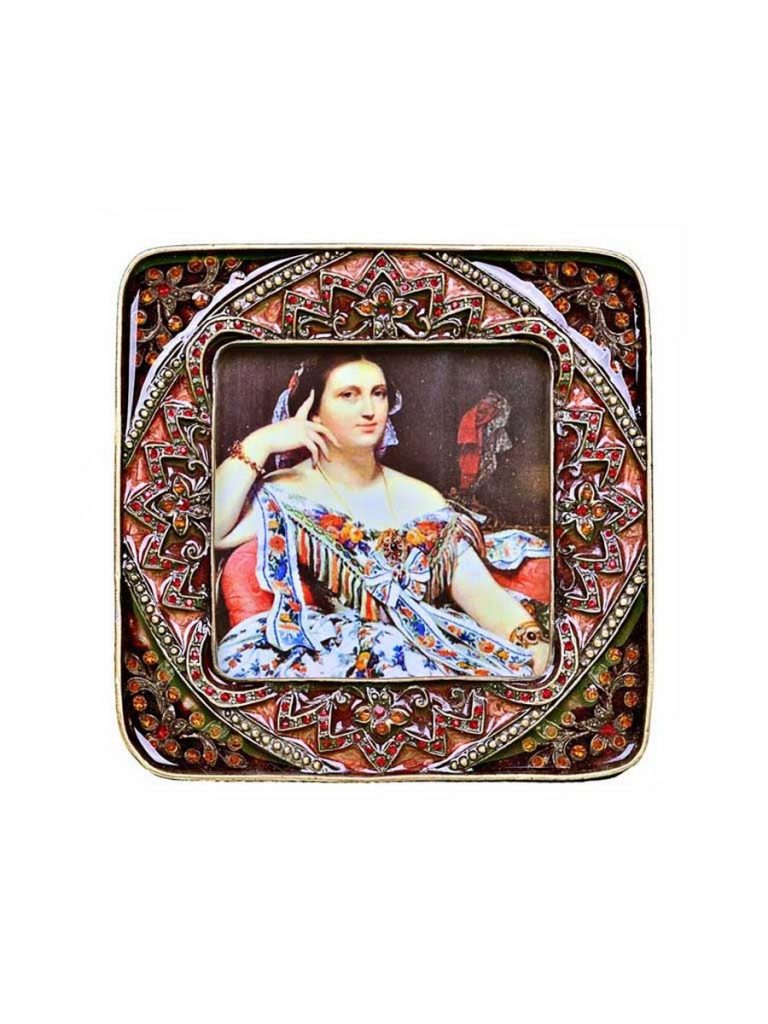 This metal picture frame has an ornate pattern set with stones, making it a beautiful setting for displaying photos of your loved ones. Hang it on the wall or place it on a shelf by itself or in the company of our other matching frames.