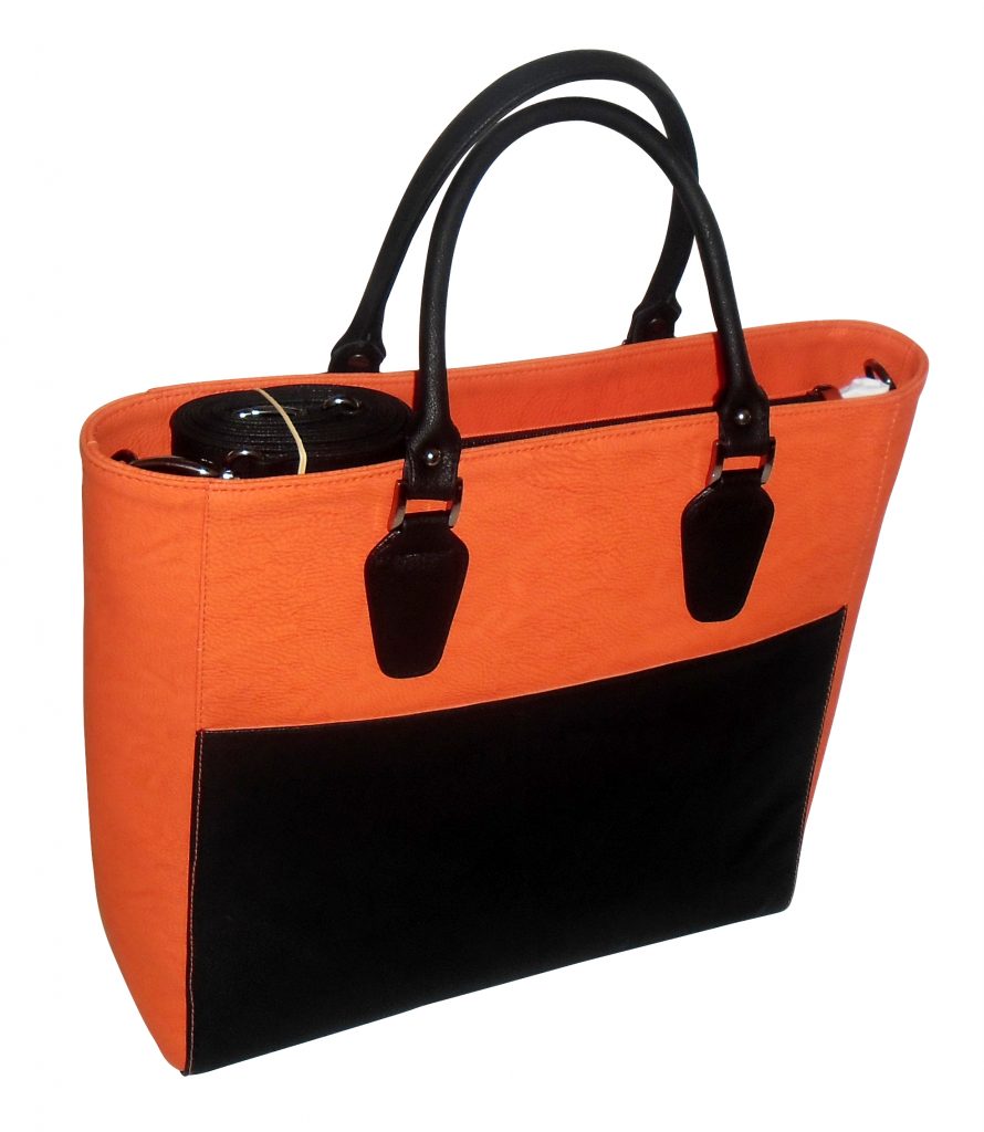 Orange bucket bag with black handheld and outer pocket.