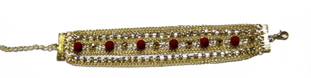 This chic and funky bracelet combines golden chains, rhinestones and ruby red Indian beads. Wear it with a simple evening dress when out on the town.