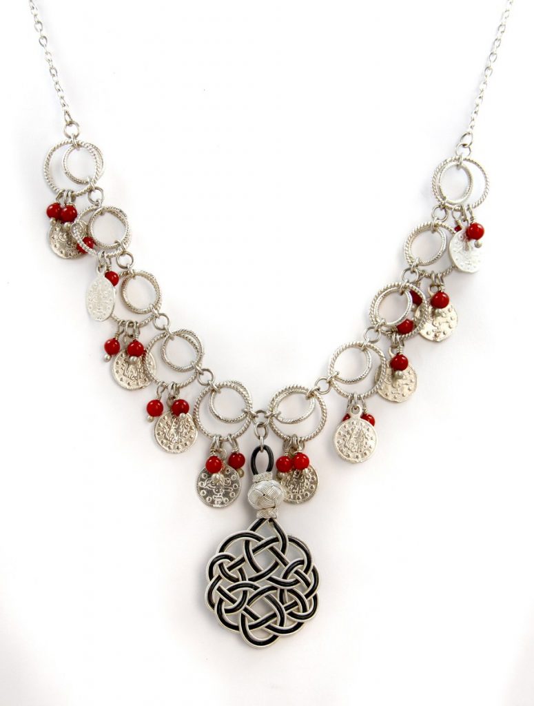 This sophisticated necklace will easily take your outfits from daytime to evening wear. With a striking pendant and red gemstone accents, wear this necklace against a blue top to complement the intricate design.