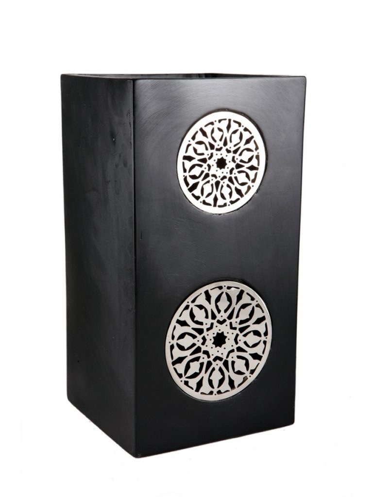 Black candle hurricanes decorated with hand cut nickel zakaref design. Each comes with an over sized tea light.